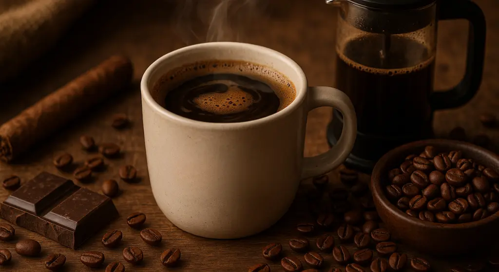 V šálku se rozvíjejí tóny hořké čokolády, kakaa, tabáku a praženého dřeva, které vytvářejí intenzivní a dlouhotrvající dojem. Středně tmavé pražení podtrhuje zemitost směsi a zároveň nechává v pozadí jemnou nasládlou linku.